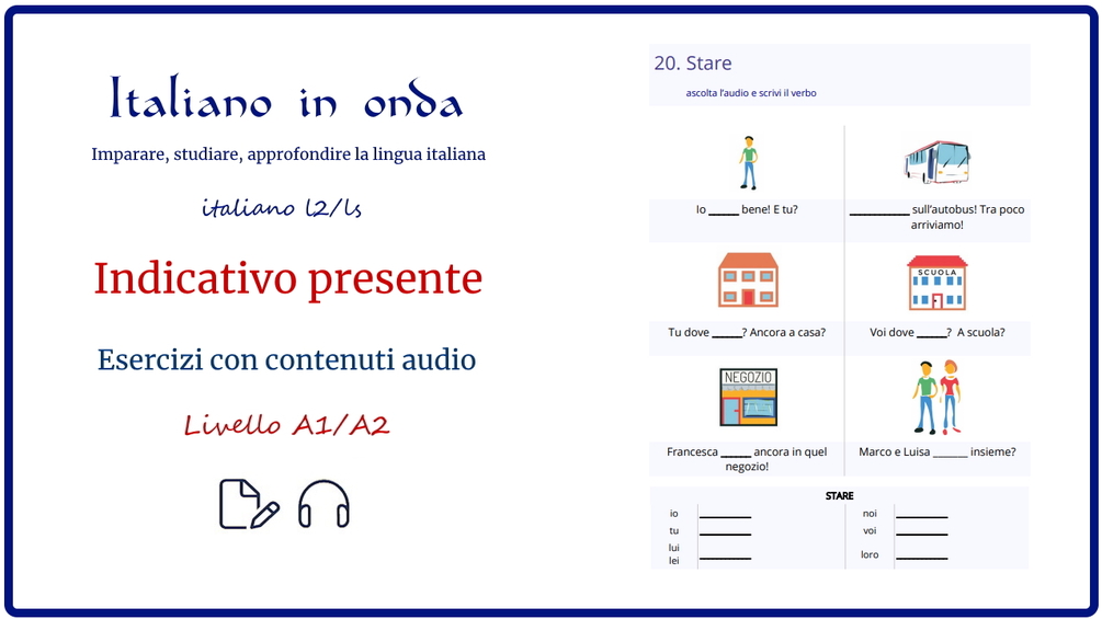 Esercizi per imparare l’indicativo presente dei verbi regolari (are, ere, ire, ire isc) e irregolari (dare, fare, andare, venire, dire, uscire, stare, volere, dovere, potere, sapere) con contenuti audio mp3